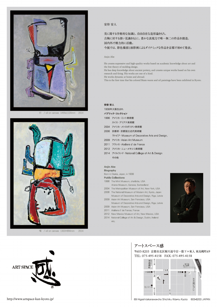 安倍 安人 ABE Anjin 3月7日(土)〜22日(日) 美に関する学術的な知識と、自由自在な造形論をもち、古陶に対する深い見識をもとに、豊かな表現力で唯一無二の作品を創造、国内外で精力的に活動。今展では、彩色備前と油彩画によるダイナミックな作品を京都で初めて発表。