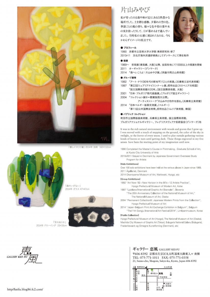 豊かな自然との交感から、優れた色彩感覚により風や光を感じさせる独自の世界を制作し続けている片山みやびを紹介します。京都では久しぶりの個展となる今展では、《自然に触れること、アートが身近にあるということ。》をコンセプトに、油彩作品とガラス作品を発表します。