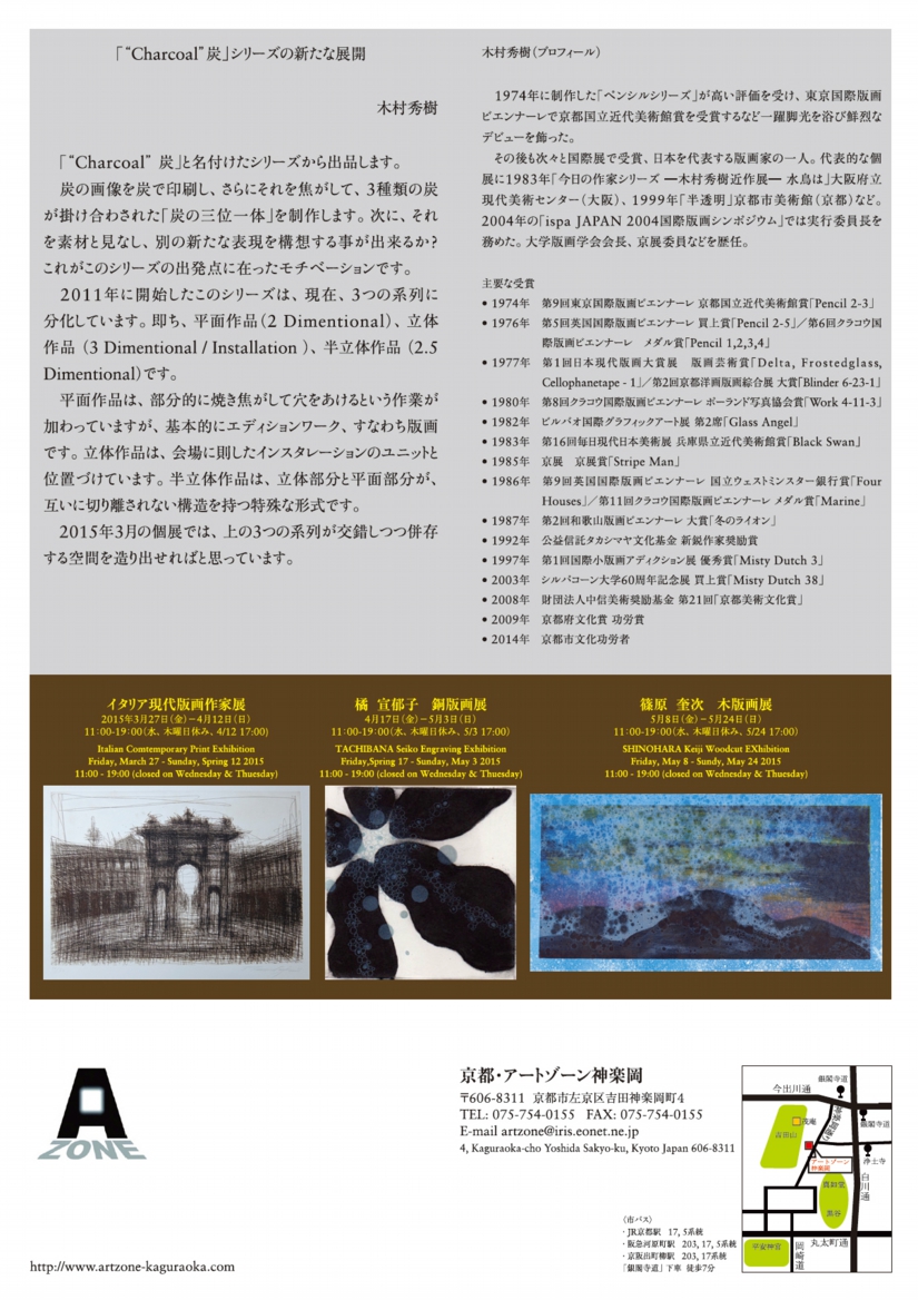 「“Charcoal”炭」シリーズの新たな展開。炭を素材に新たな表現を構想したシリーズで、2011年から始まるこのシリーズは平面作品、立体作品、半立体作品の3系列に分化している。平面作品は部分的に焼き焦がすなどしたエディションワークの版画。立体作品は会場に合わせ展開するインスタレーションユニットとして位置付け。半立体作品は立体部分と平面部分が互いに切り離されない構造を持つ特殊な形態。このような分化した3つの系列が交錯しつつ併存する空間を造り上げます。 1948年生まれ。画家/版画家、京都市立芸術大学名誉教授。