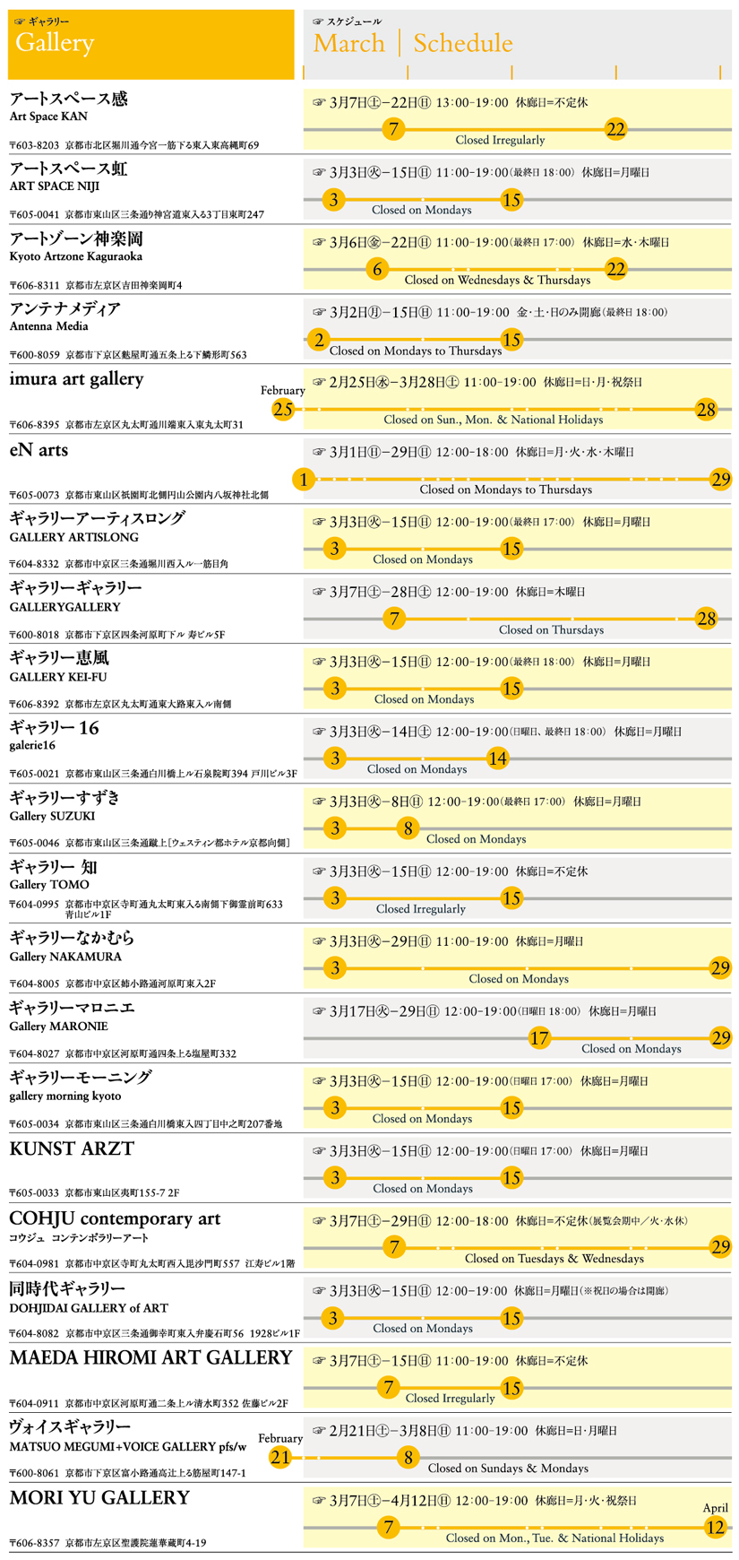 各ギャラリーでは、現代美術の展覧会を開催しています。「kyoto Art Map 2015」版(A2サイズ・無料配布中)をご利用ください。